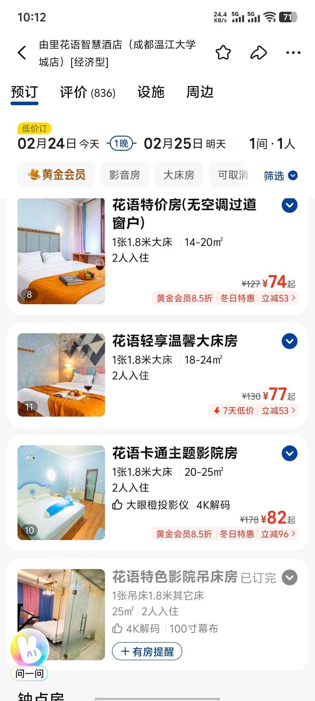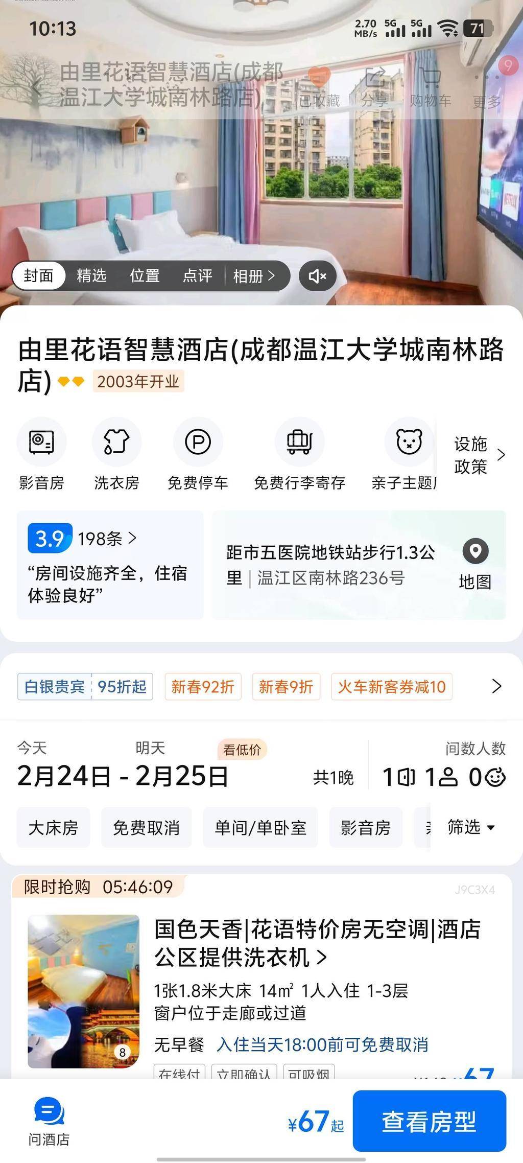 酒店位于成都市温江区温江大学城,27间客房,门口有停车位,携程排行商圈第二,美团评分4.9,抖音已上架。因个人发展原因,现低价转让。
